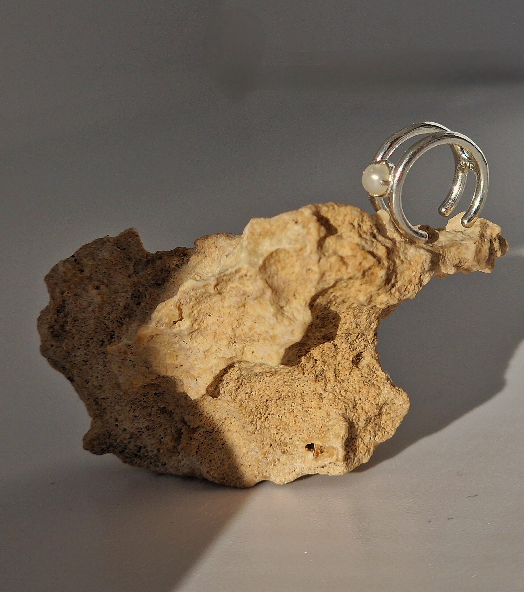 Earcuff-ul este realizat din argint si o perla de cultura de 4 mm. Are diametru de 11,5 mm, latimea de 5 mm si grosimea de 1,3 mm.