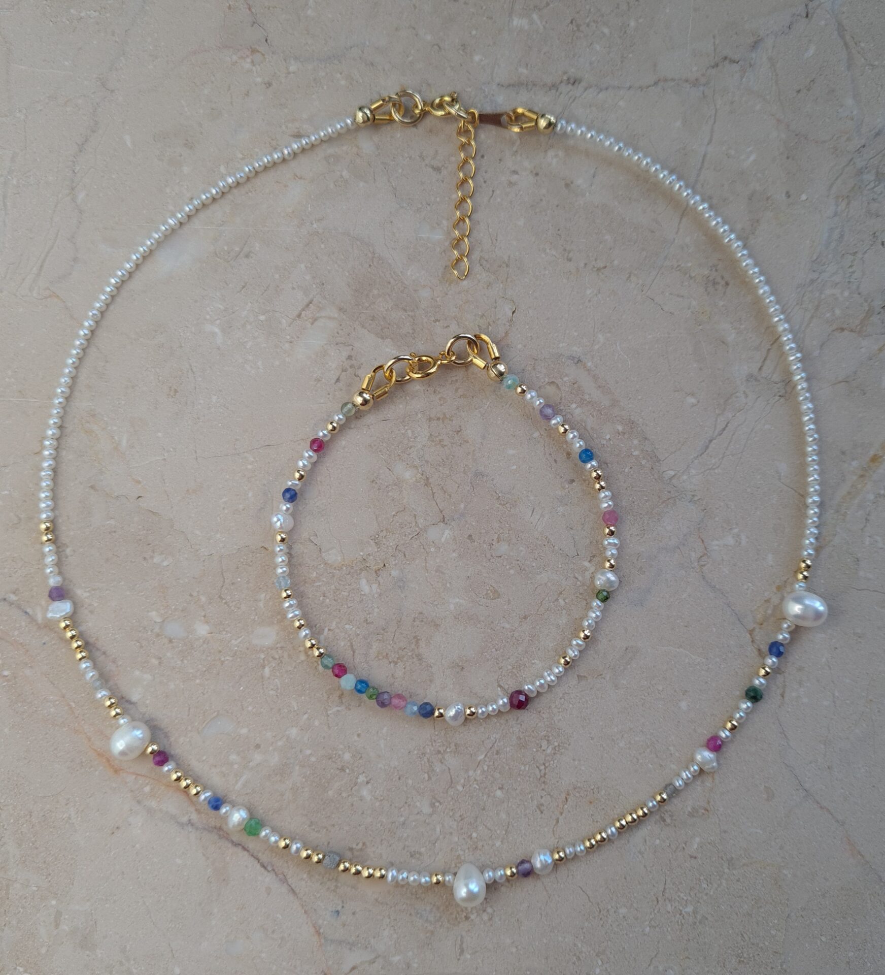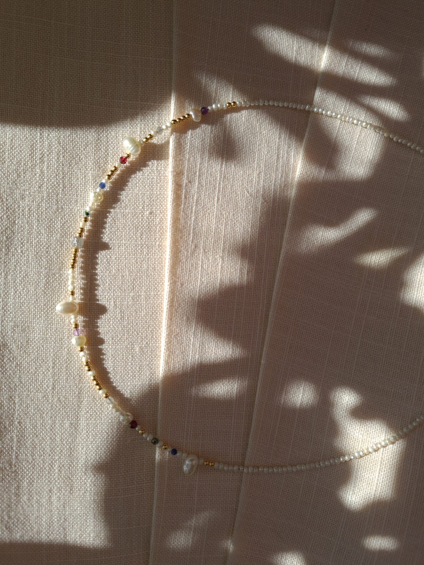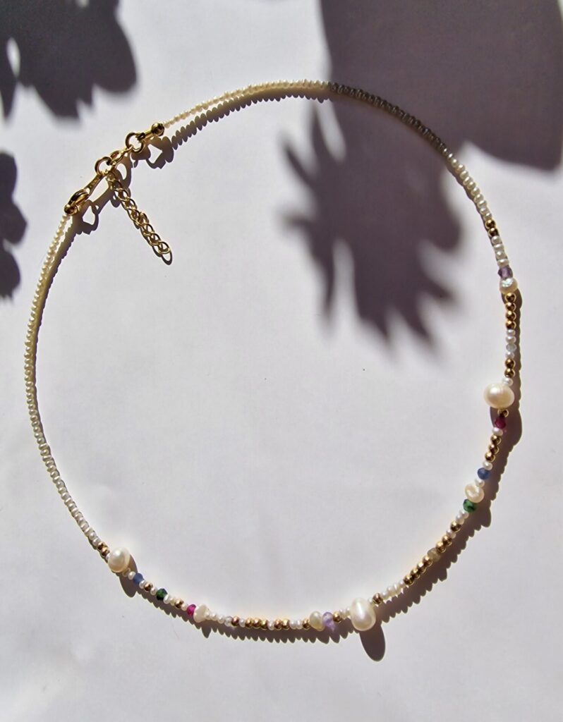 Colierul este realizat cu microperle de cultura 1,8-2mm, perle de cultura cu forma neregulata 3-3,5mm, perle de cultura ovale 4-5mm, diamant brut in forma de cub 2-2,75mm (0,12ct- 0,25ct), 5 pietre semipretioase 2mm (ametist, rubin, rubin zoisit, labradorit si sodalit), bilute din argint filat cu aur 2mm si accesorii din argint filat cu aur.