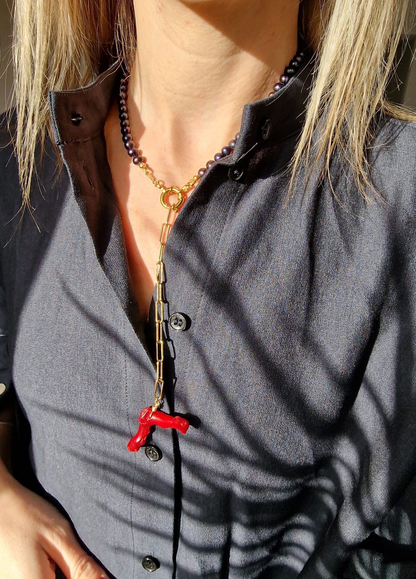 Colierul este realizat perle de cultura bleumarin 5-6mm, 1 crenguta de coral rosu 32×51-10x26mm de diferite forme, inchizatoare din argint filat cu aur 14,5x3mm, 10 cm lant cu verigi ovale din argint filat cu aur13,3×4,8×1,1mm si accesorii din argint filat cu aur.