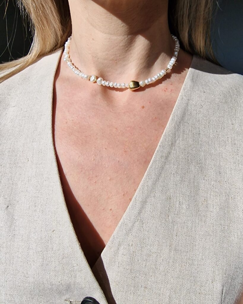 Colierul este realizat cu perle de cultura 4-5mm, resprectiv 8-9mm, pandantiv si accesorii din argint filat cu aur.