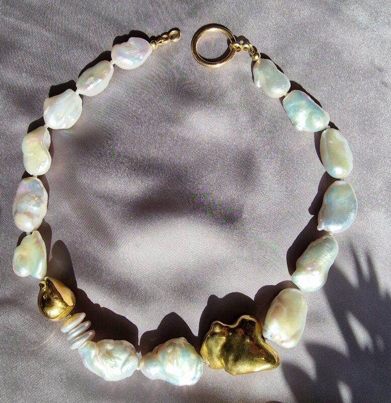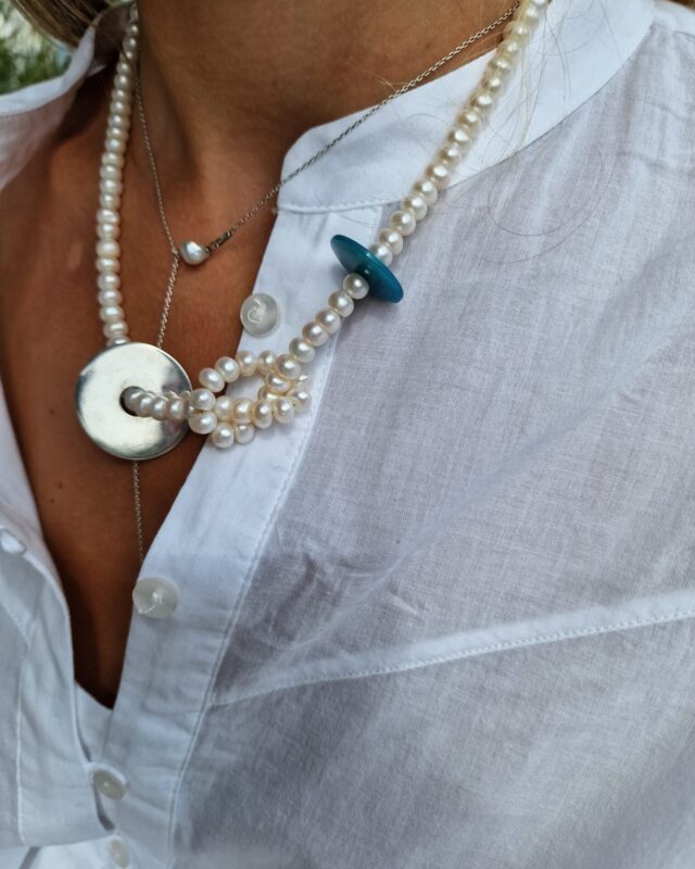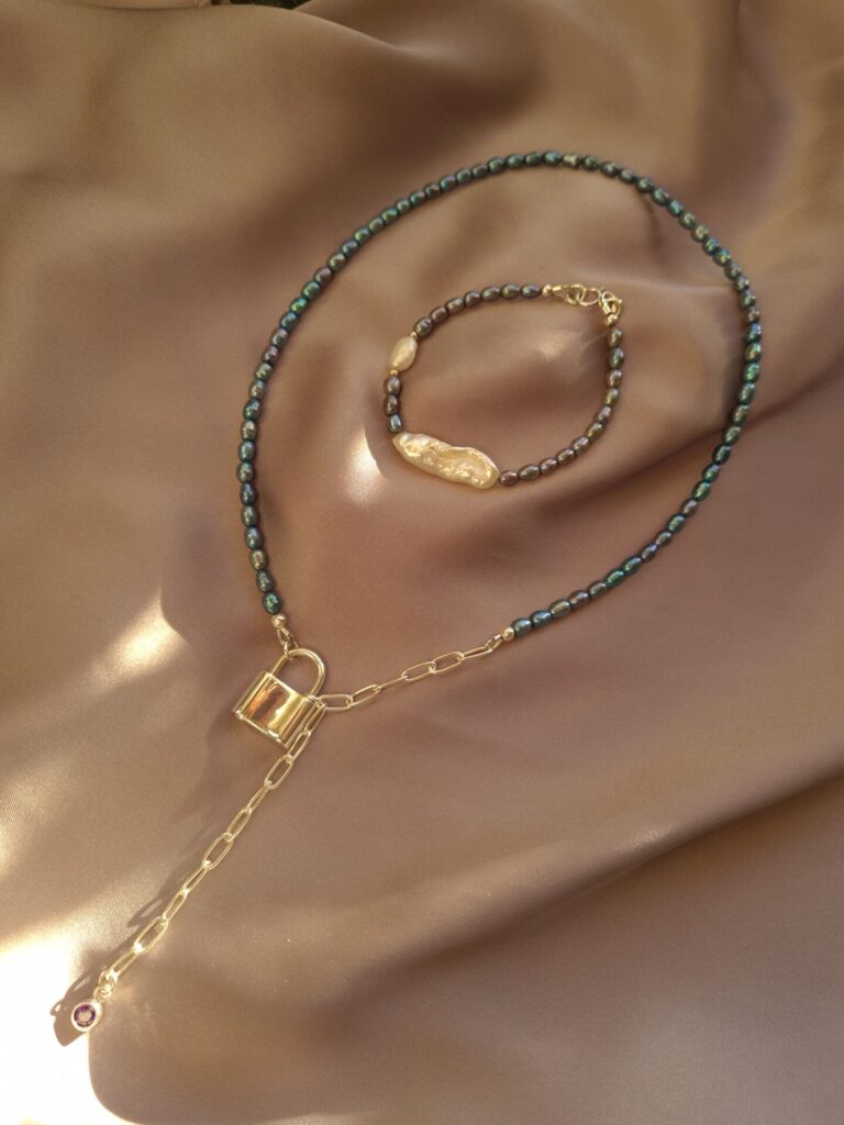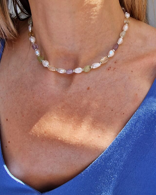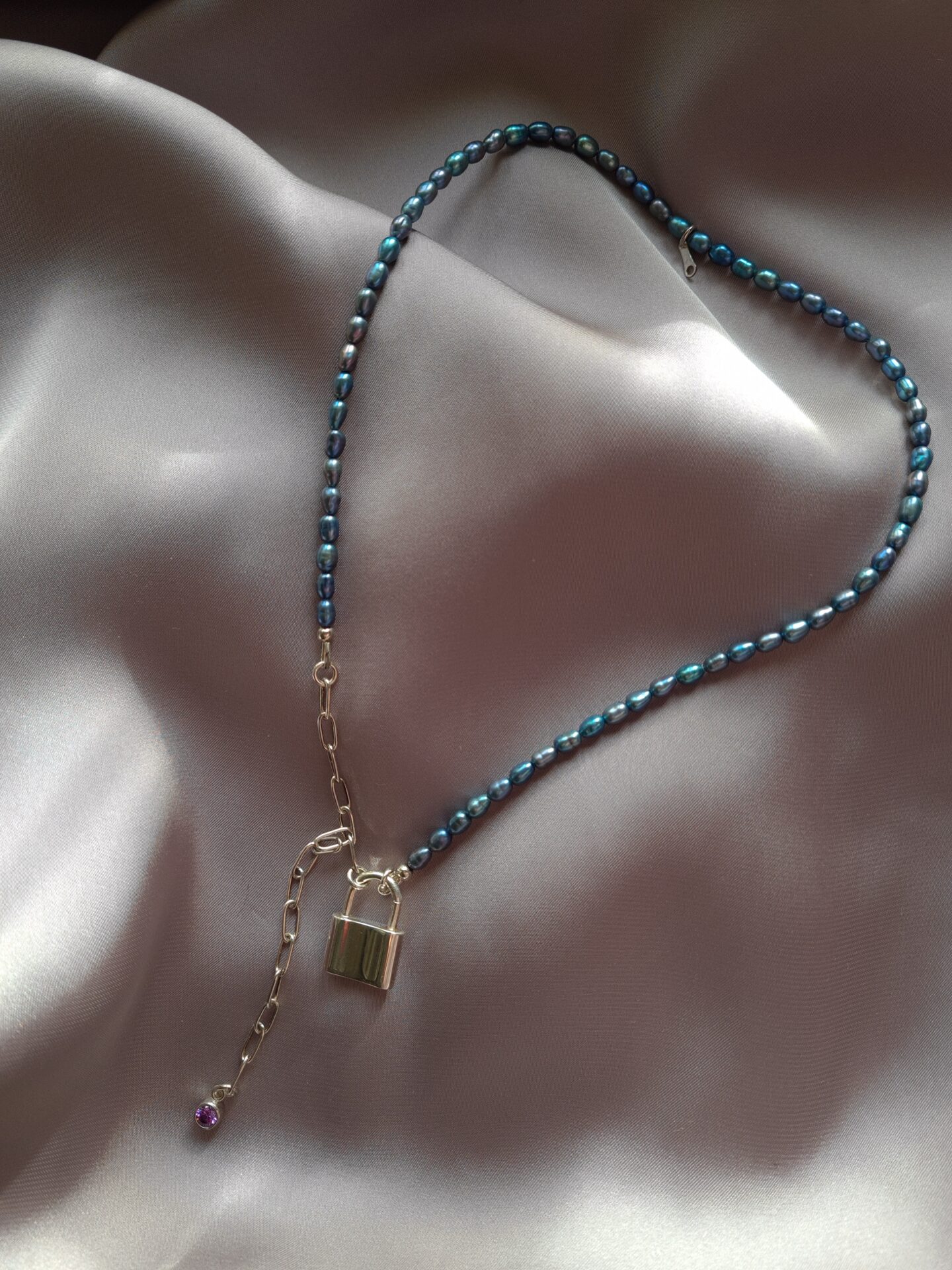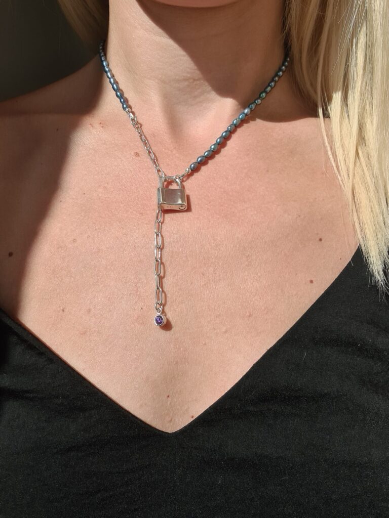 Colierul este realizat cu perle de cultura ovale 3,5-4mm, pandativ cu cristal zirconia culoarea ametistului, inchizatoare din argint in forma de lacat 16mm, lant din argint cu verigi ovale si accesorii din argint.