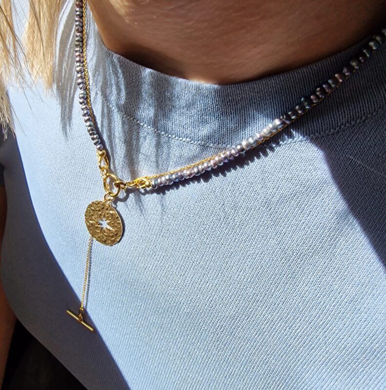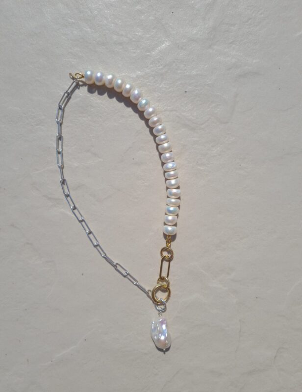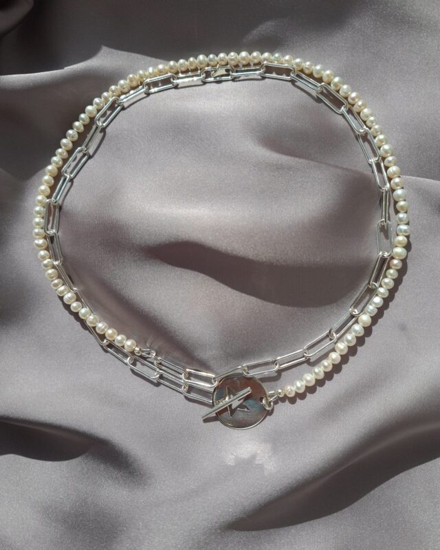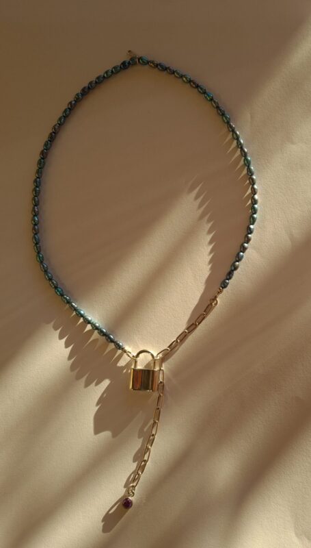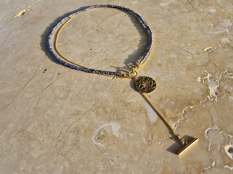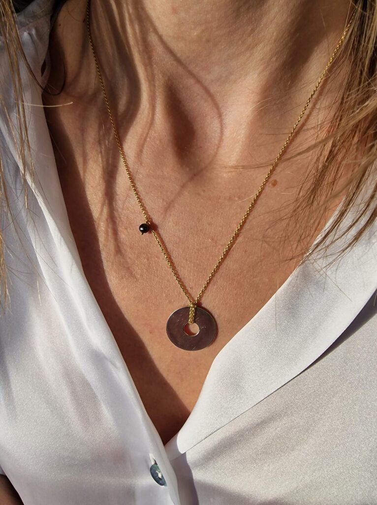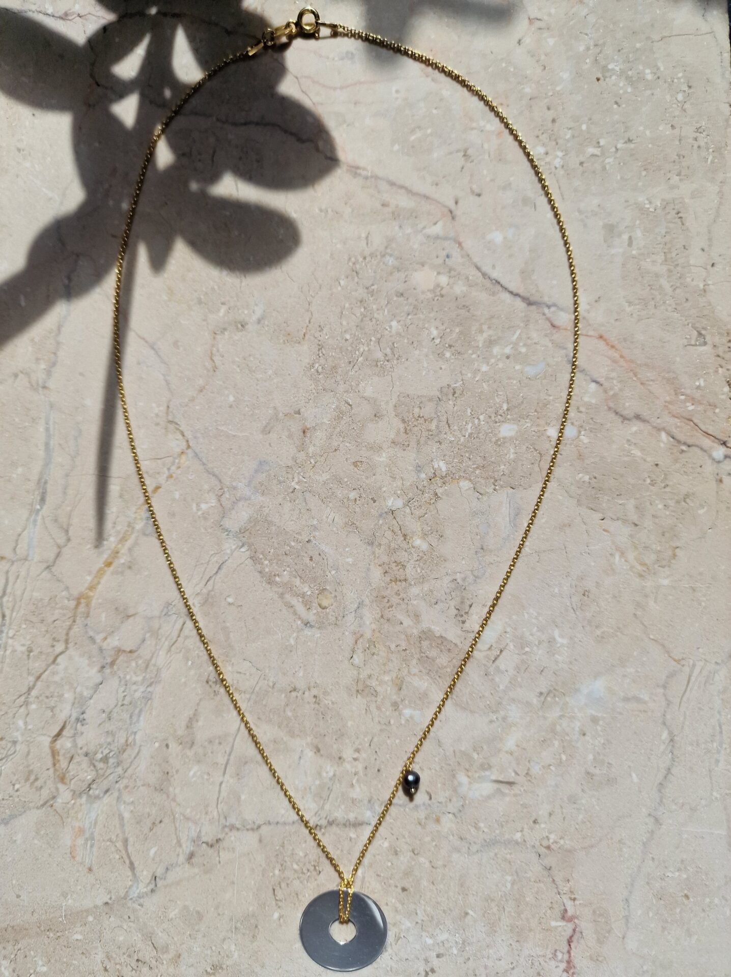 Colierul este realizat din lant din argint filat cu aur 1mm x 50cm, disc din argint 2cm, o perla de cultura de culoare inchisa 3- 3,5cm si accesorii din agint.