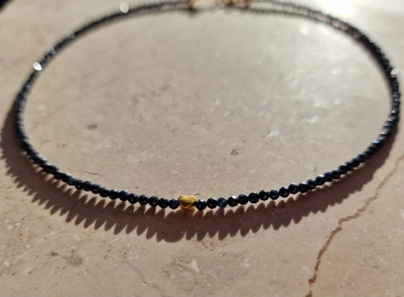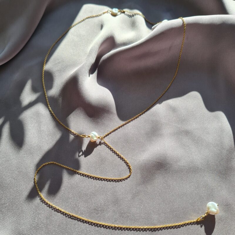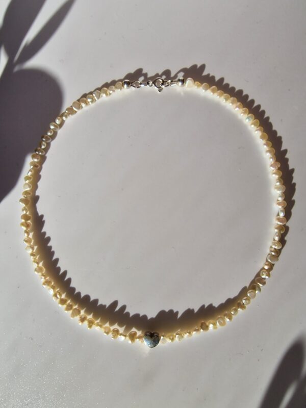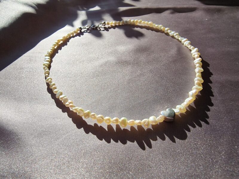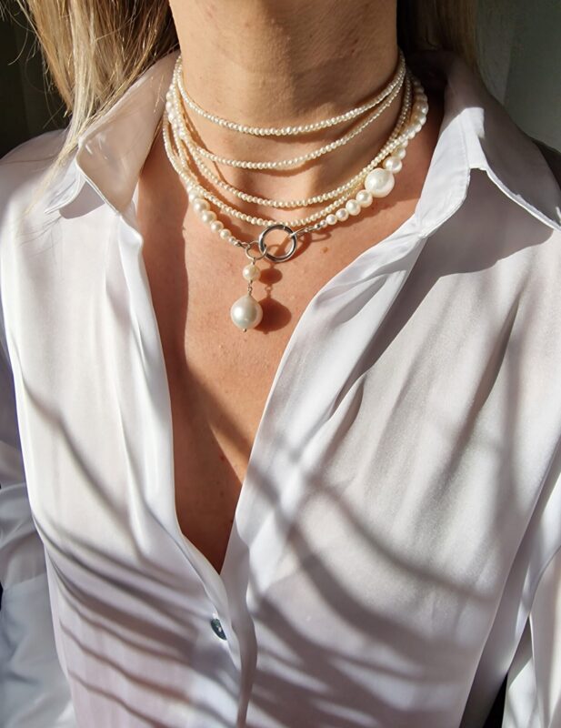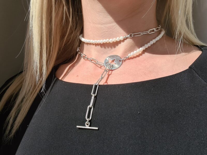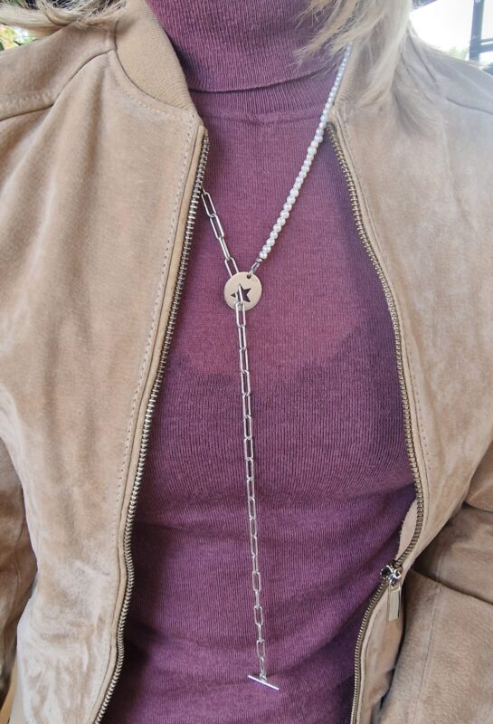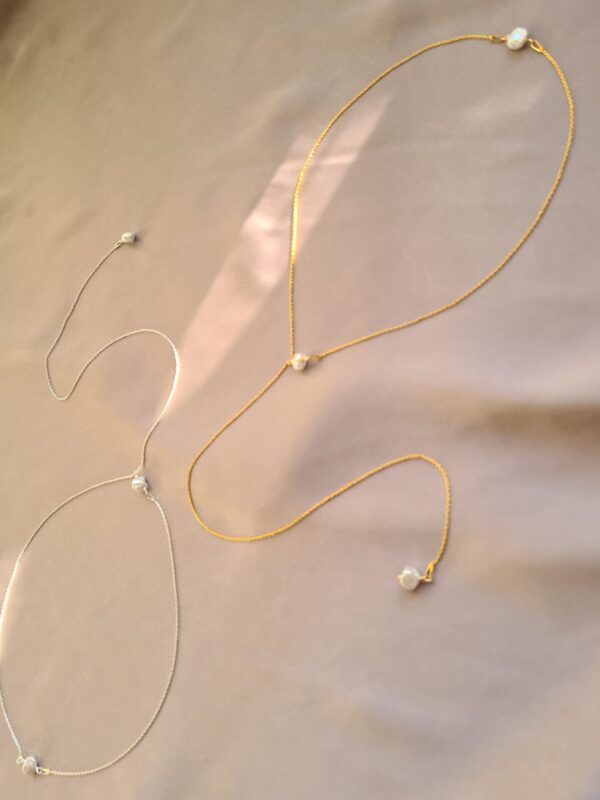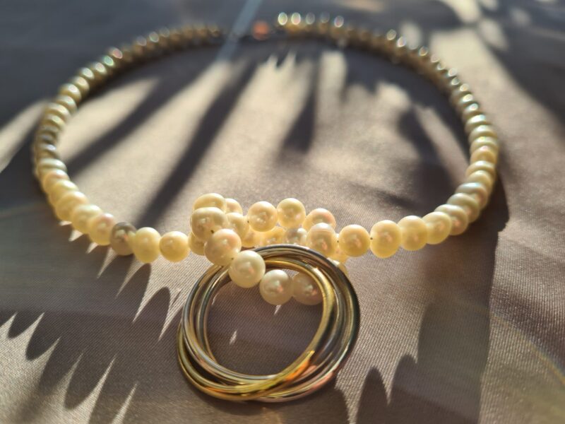 Colierul este realizat din lant din argint filat cu aur 1mm x 50cm, disc din argint 2cm, o perla de cultura de culoare inchisa 3- 3,5cm si accesorii din agint.
