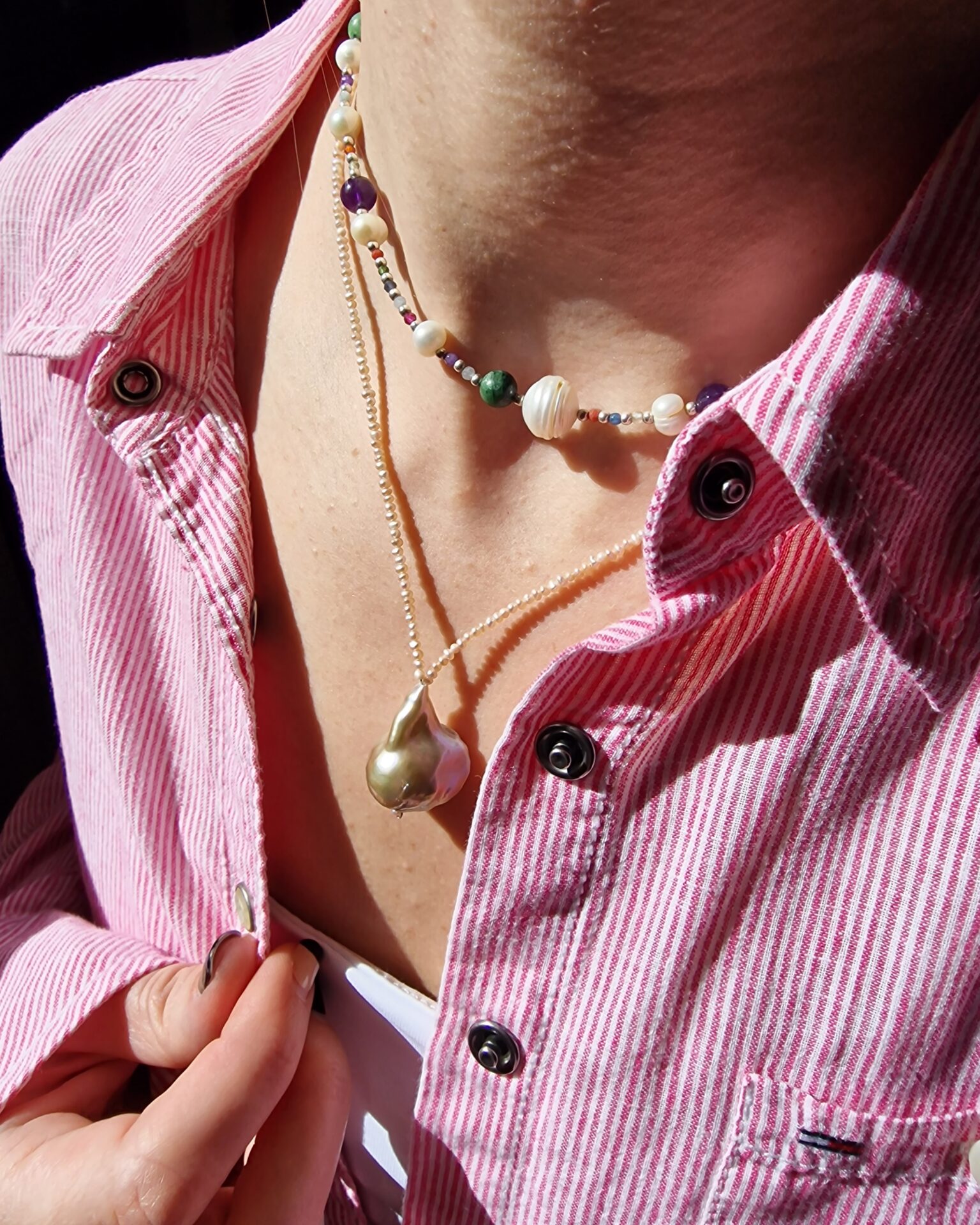 Colierul este realizat cu perle de cultura 2 marimi, respectiv 6 – 7 mm si 9 – 10 mm, pietre semipretioase de 2 marimi respectiv 2 mm si 8 mm, bilute din argint 2mm si accesorii din argint.