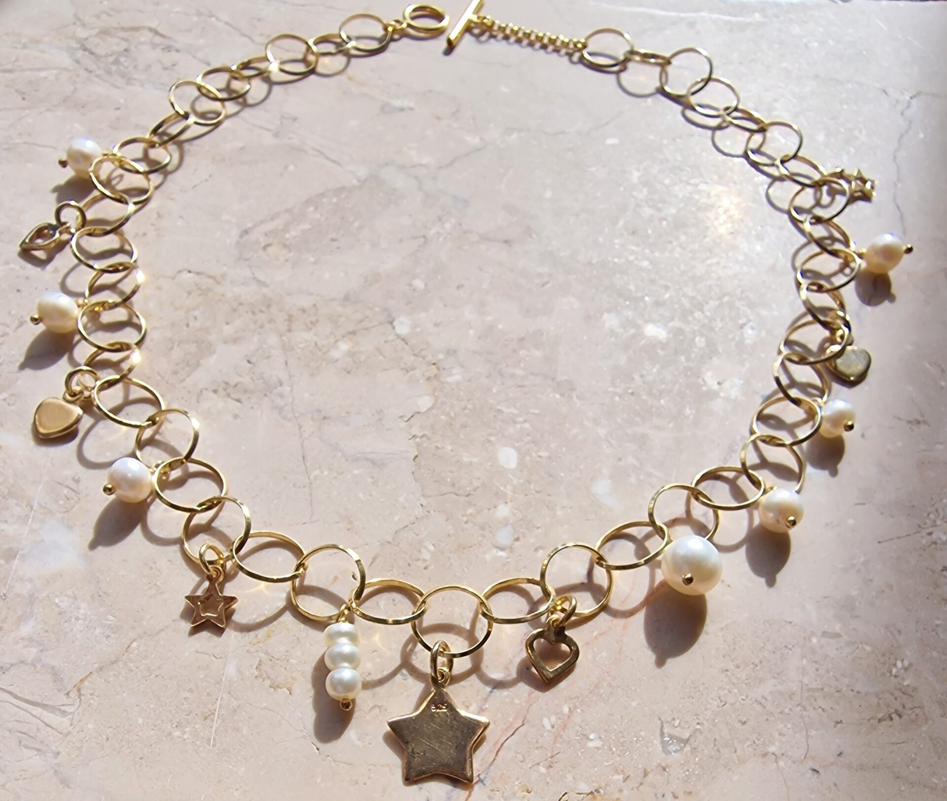 Colierul este realizat din lant de argint filat cu aur, verigi rotunde 10 mm, pandantive din argint filat cu aur in forma de stea 12 x 14mm, resprectiv 6mm, pandantive in forma de inima din argint filat cu aur 7 mm, perle de cultura de culoare alba de diferite marimi: 7 x 7,5mm , 6 – 7 x 5 mm, respectiv 4 mm, inchizatoare din argint filat cu aur, cerc 10 mm si tija de 19 mm si accesorii din argint filat cu aur.