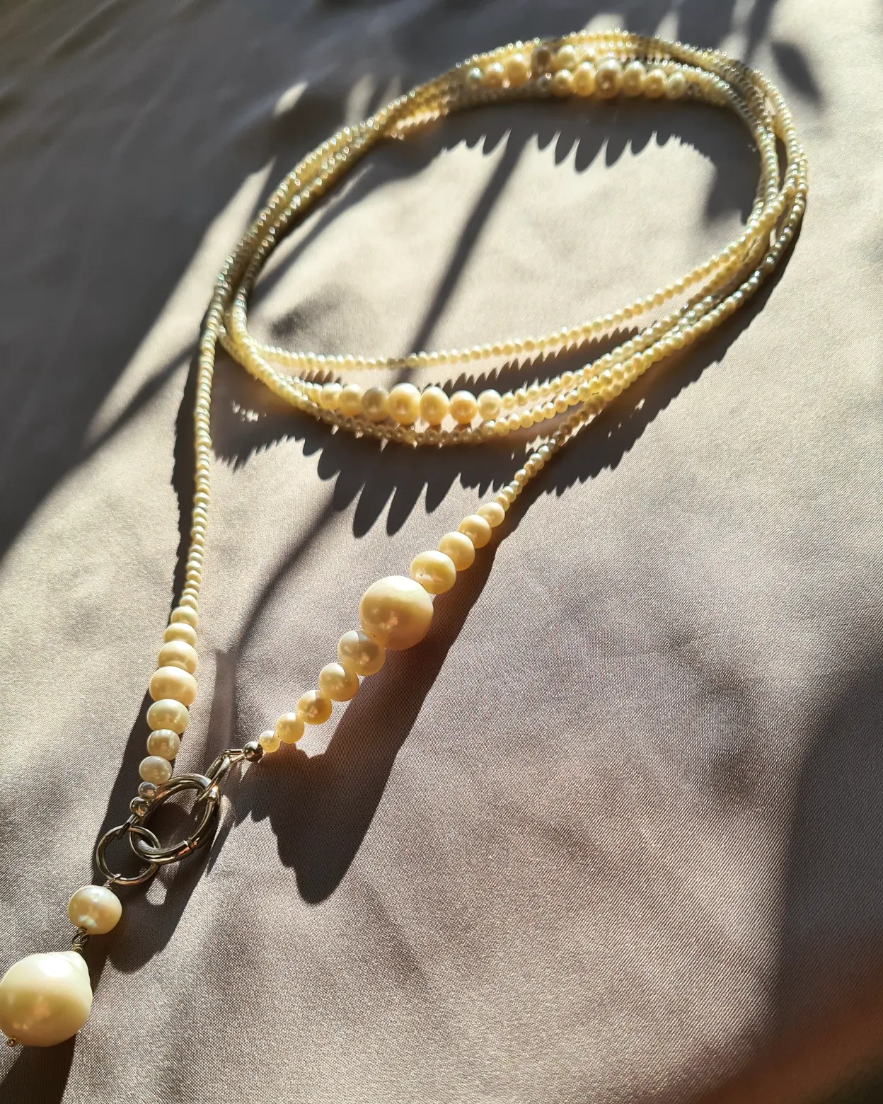 Colierul este realizat cu perle de cultura de diferite marimi si anume: microperle 2,5-3mm, perle 3-4mm, perle 4-5mm, perle 6-7mm, perle 7-8mm, si perle 11-13mm, asezate descrescator, inchizatoare din argint 17 mm, 2 verigi rotunde din argint 10mm si accesorii din argint.