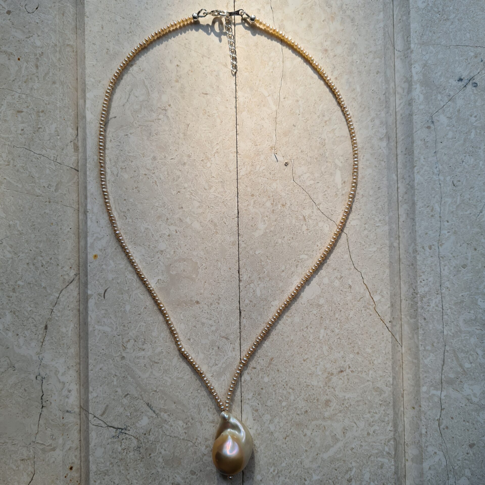 Colierul este realizat cu microperle de cultura de culoare naturala, o perla de cultura baroc de culoare naturala si accesorii din argint.
