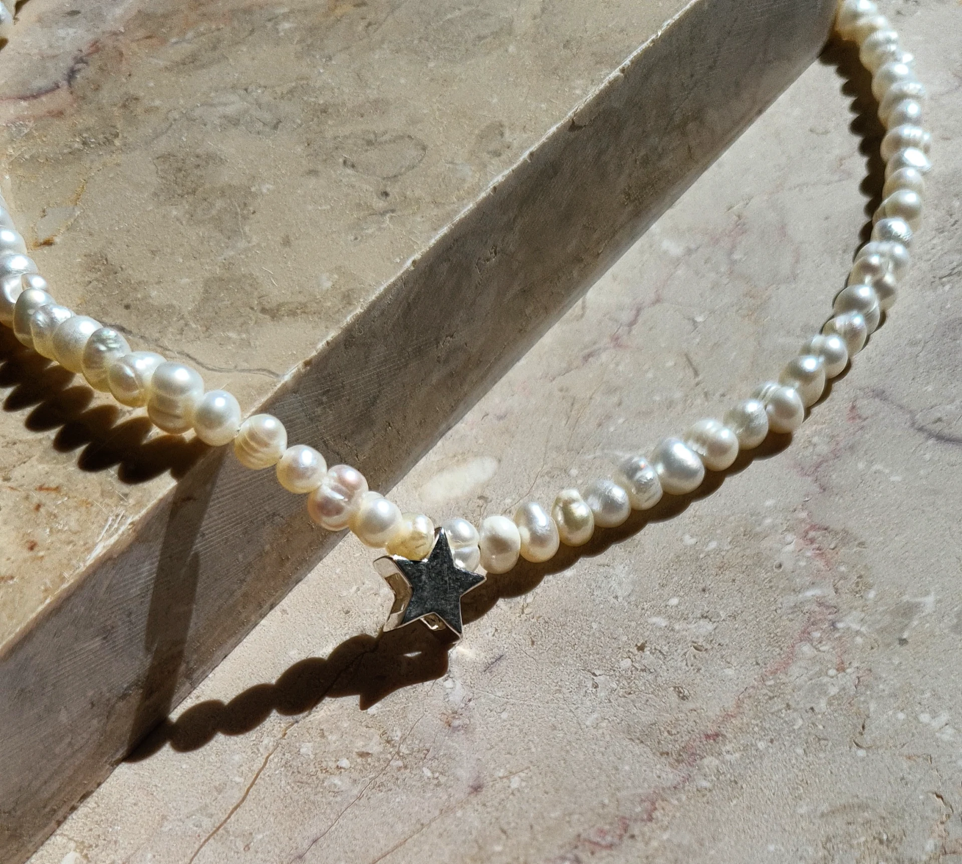 Colierul este realizat cu perle de cultura 4-5mm, pandativ din argint in forma de stea 5x10mm si accesorii din argint.