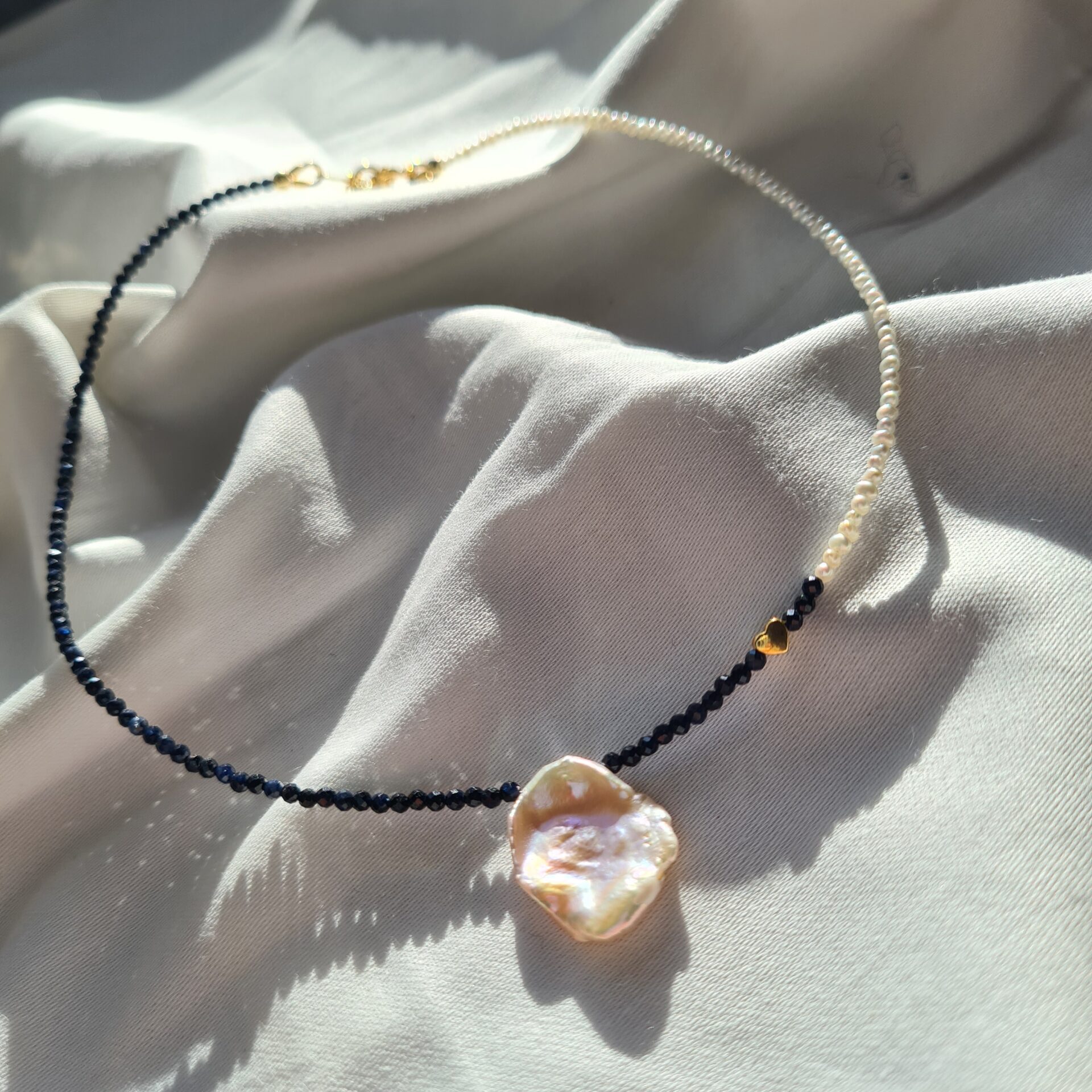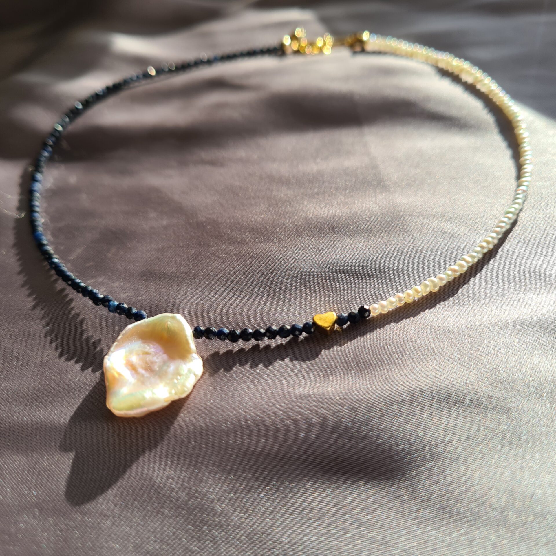 Colierul este realizat cu microperle de cultura, margele din safir 2mm, o perla de cultura keshi, pandantiv in forma de inima din argint filat cu aur 3,4x4mm si accesorii din argint filat cu aur.
