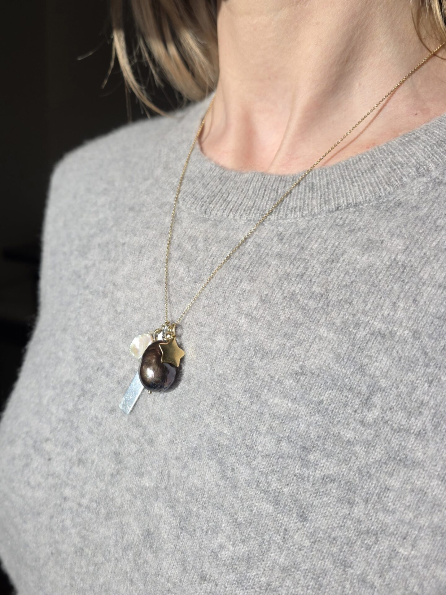 Colierul este realizat din lant de argint filat cu aur 1 mm x 50 cm, o perla baroc de culoare inchisa ~ 15 x 20 mm, o perla keshi alba 10 x 14 mm, o stea din argint filat cu aur 11 mm, dreptunghi din argint 6,5 x 40 mm si accesorii din argint filat cu aur.