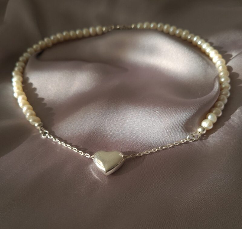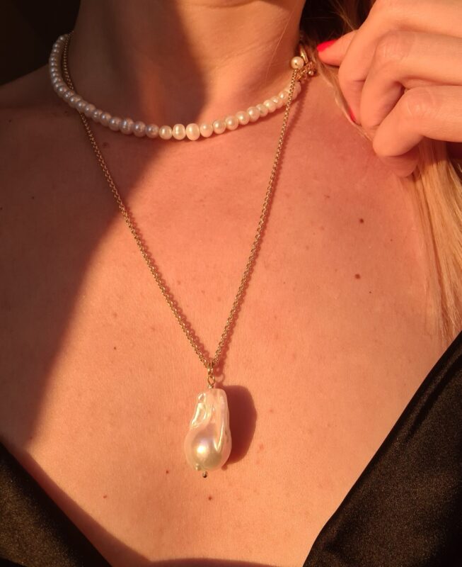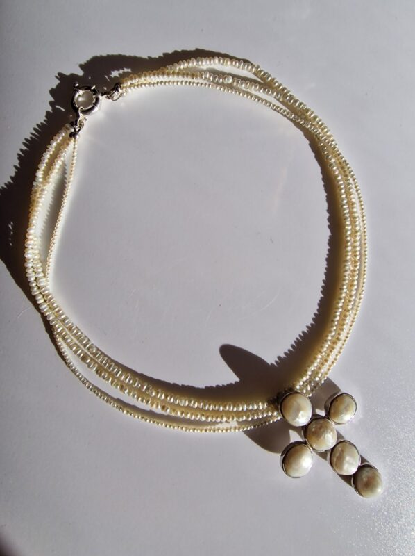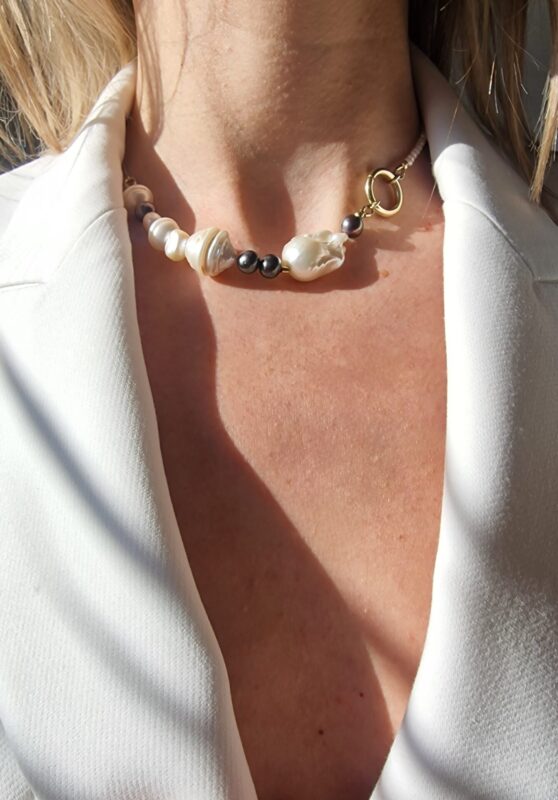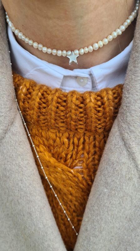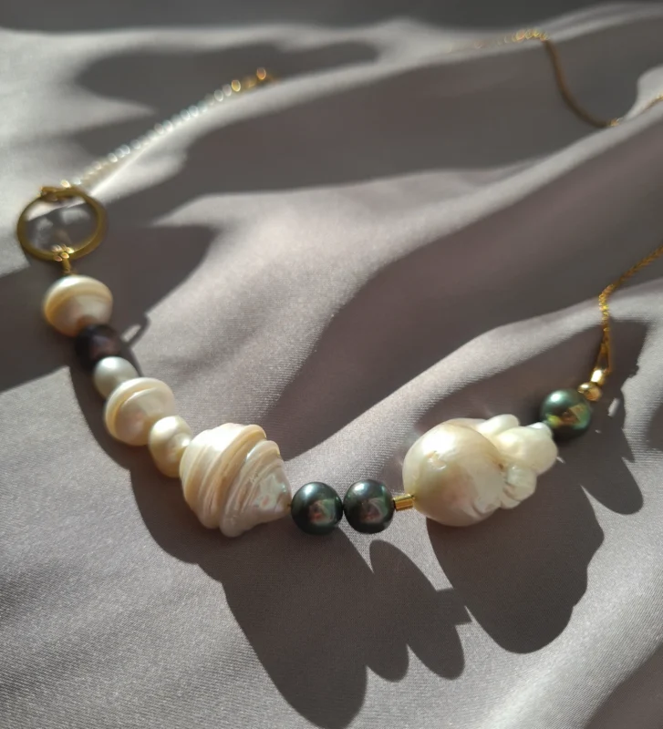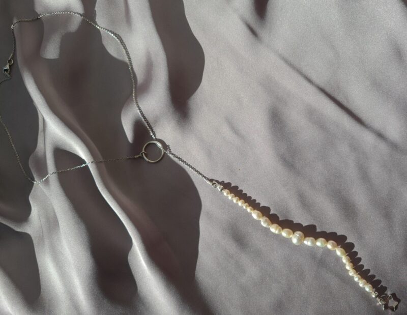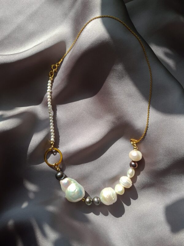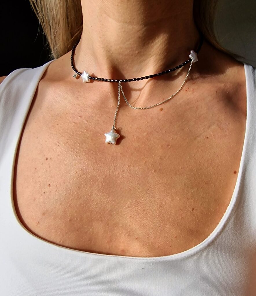 Colierul este realizat cu perle de cultura negre „rice” 2,5-3,5 mm, 3 perle albe de cultura in forma de stea 1 cm, pandantiv cu cubic zirconia 3,3 x 7,5 mm, lant din argint 1 mm grosime si accesorii din argint.
