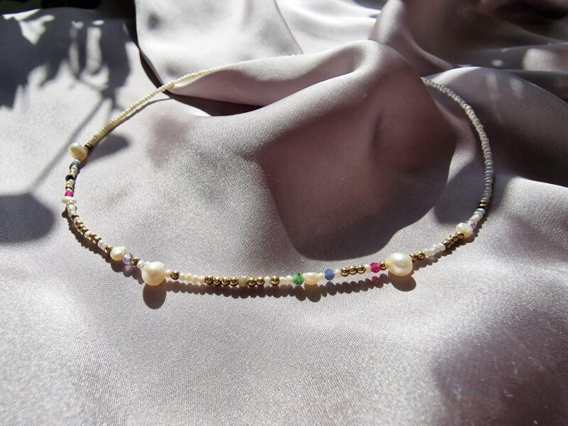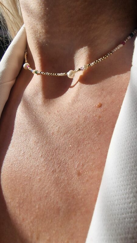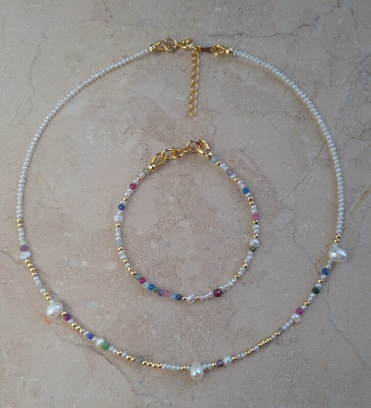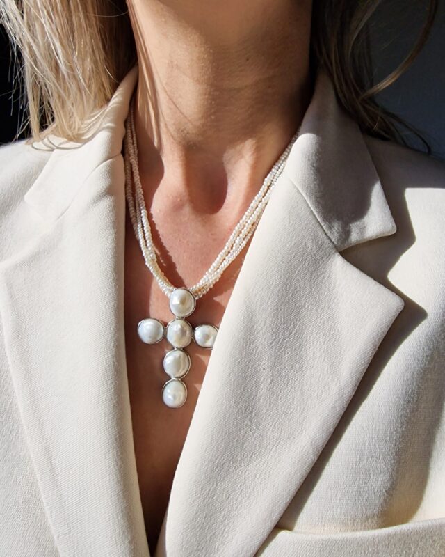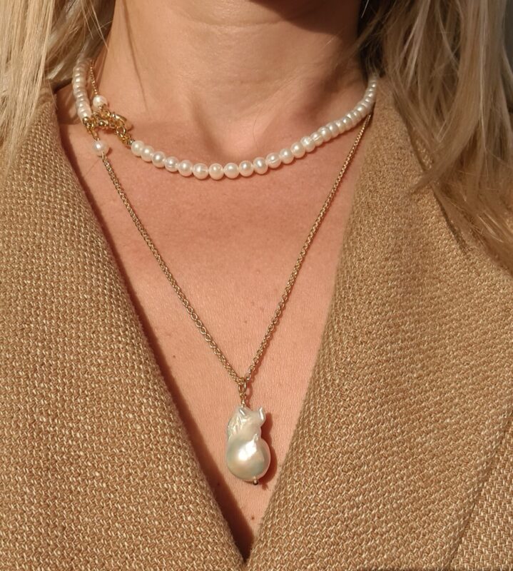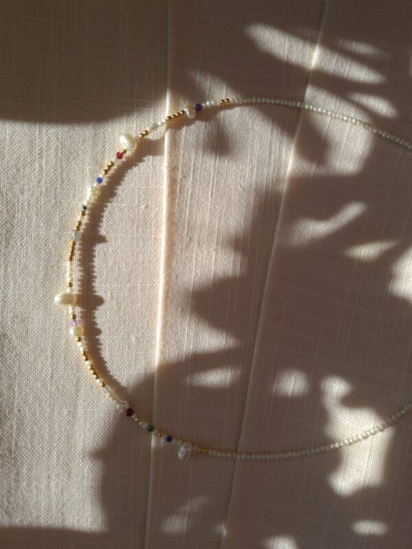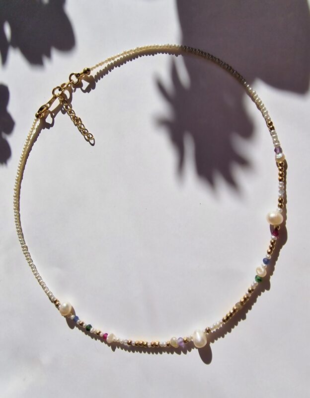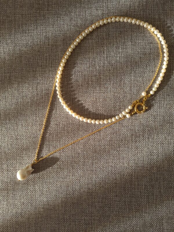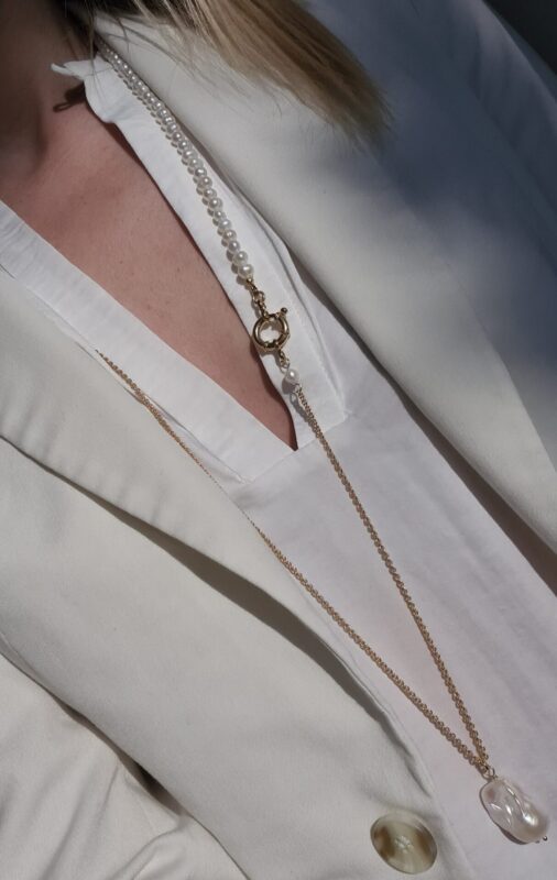 Colierul este realizat cu perle de cultura negre „rice” 2,5-3,5 mm, 3 perle albe de cultura in forma de stea 1 cm, pandantiv cu cubic zirconia 3,3 x 7,5 mm, lant din argint 1 mm grosime si accesorii din argint.